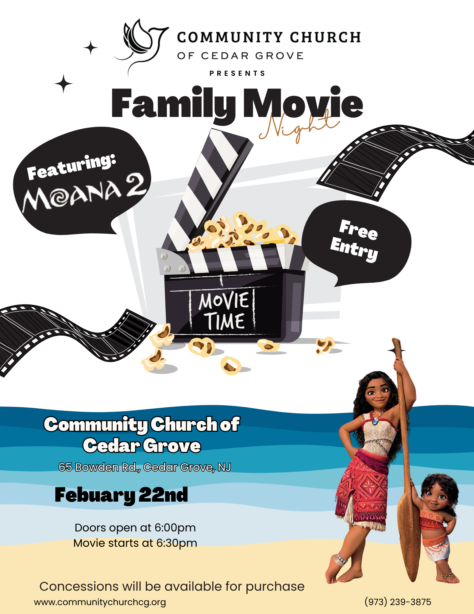 Family Movie NightSaturday, February 22, 2025, 6:00 PM - 9:00 PMCategory: Community Events, preschoolRoom: Fraizer HallCoordinator: Danielle McHughCoordinator Email: cedirector@communitychurchcg.org Previous Page